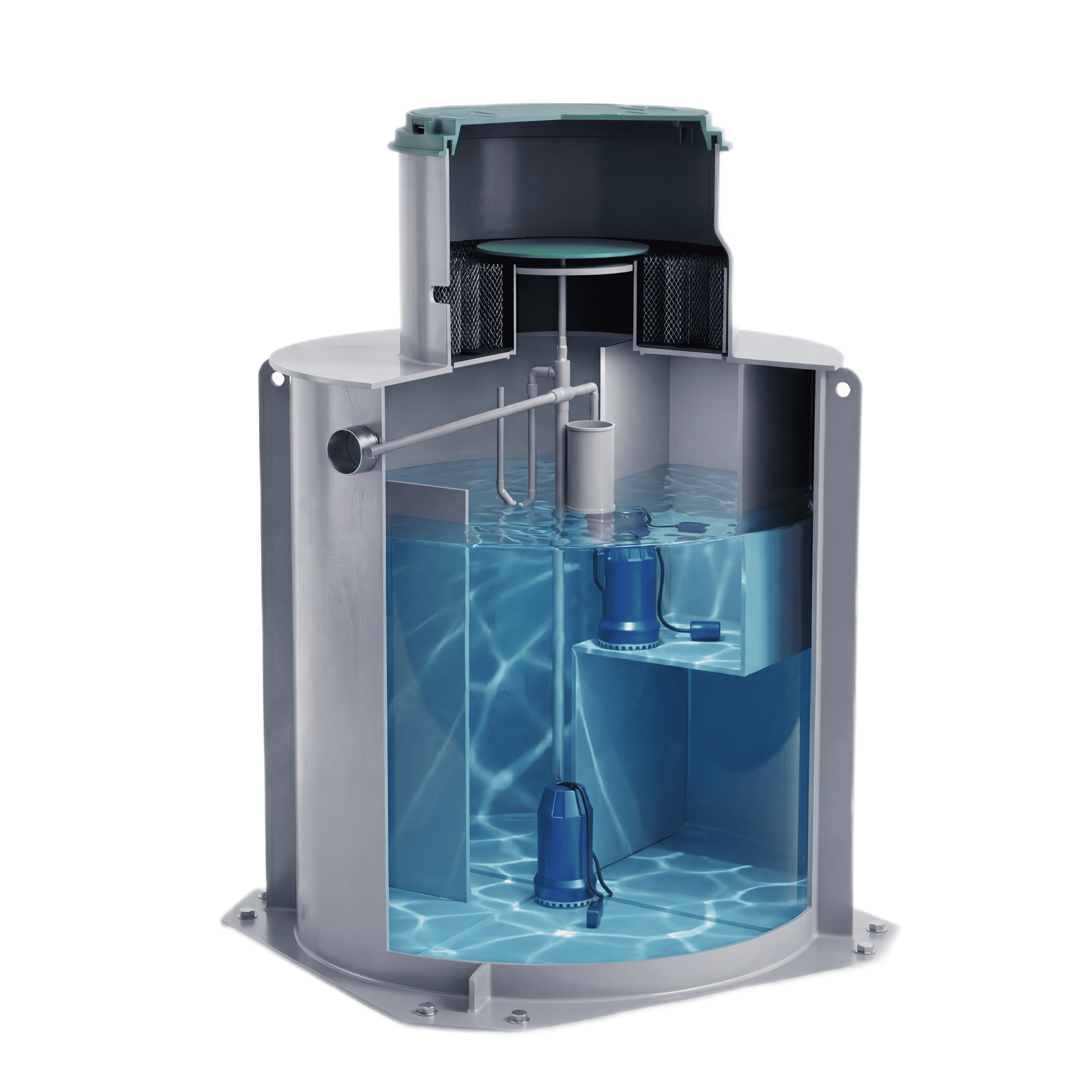 Станция подключается к канализационным трубам и электрической сети для работы насоса